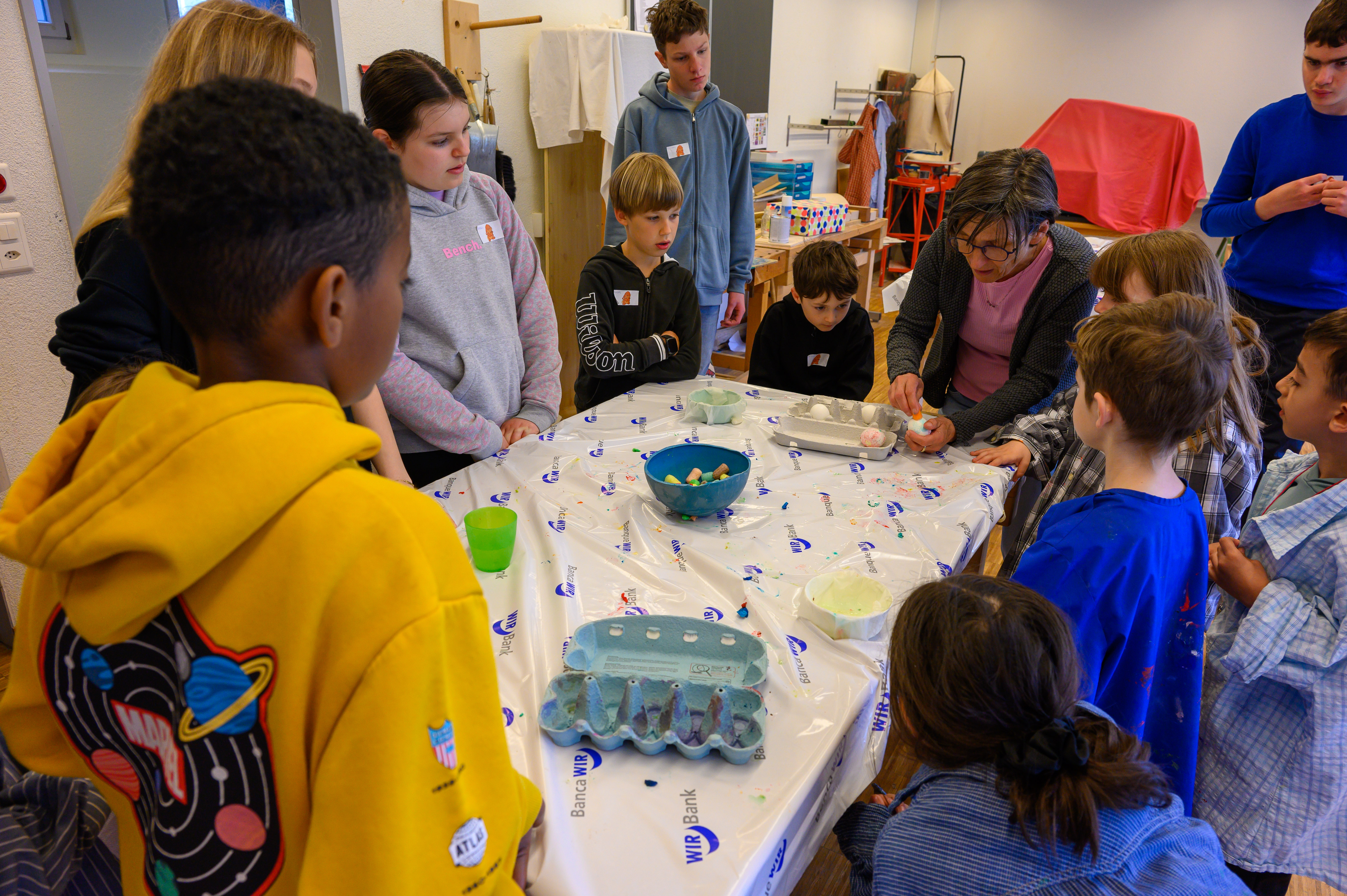 Vorab wurde im Schulzimmer ein Ostertäschchen gestaltet. Nach der Begrüssung und dem gemeinsam gesungenen Lied «Oschterhas im Gras» von Andrew Bond, machten sich die Kinder in alters- und schuldurchmischten Gruppen auf zu verschiedenen Erlebnisangeboten.