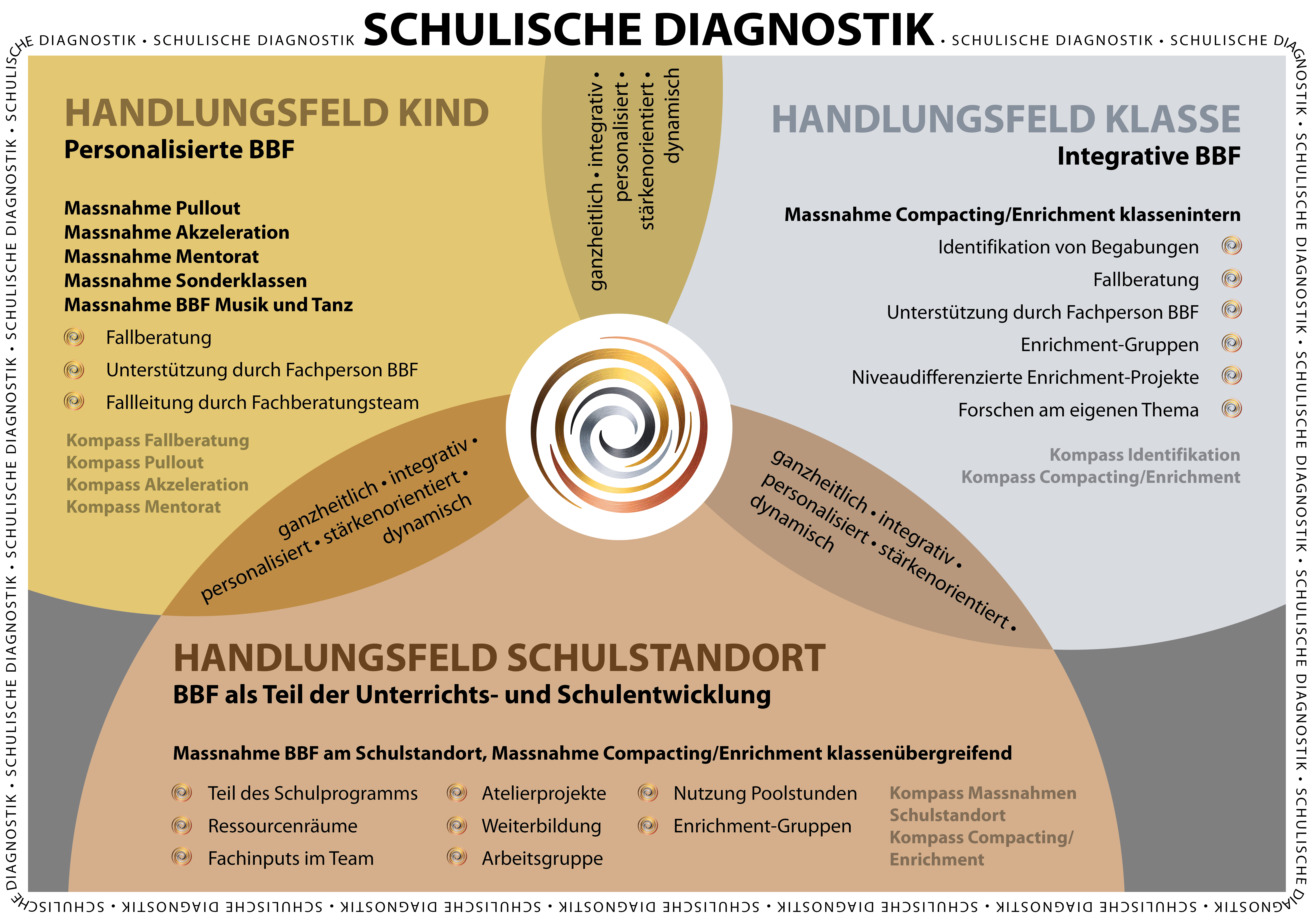 Der erste Ort für Begabungs- und Begabtenförderung ist das Klassenzimmer. Im Zentrum steht das Kind, sein individuelles Potenzial und eine stärkenorientierte pädagogische Haltung im Sinne von BBF für Alle. Eine professionelle Schulische Diagnostik ermöglicht es, die Fähigkeiten und Interessen der Schülerinnen und Schüler zu erkennen und diese in die Unterrichtsplanung einzubeziehen. Die Klassenlehrpersonen werden dabei durch ein Fachberatungsteam unterstützt und befähigt, ihre Schülerinnen und Schüler in passenden Lernsettings zu fördern.