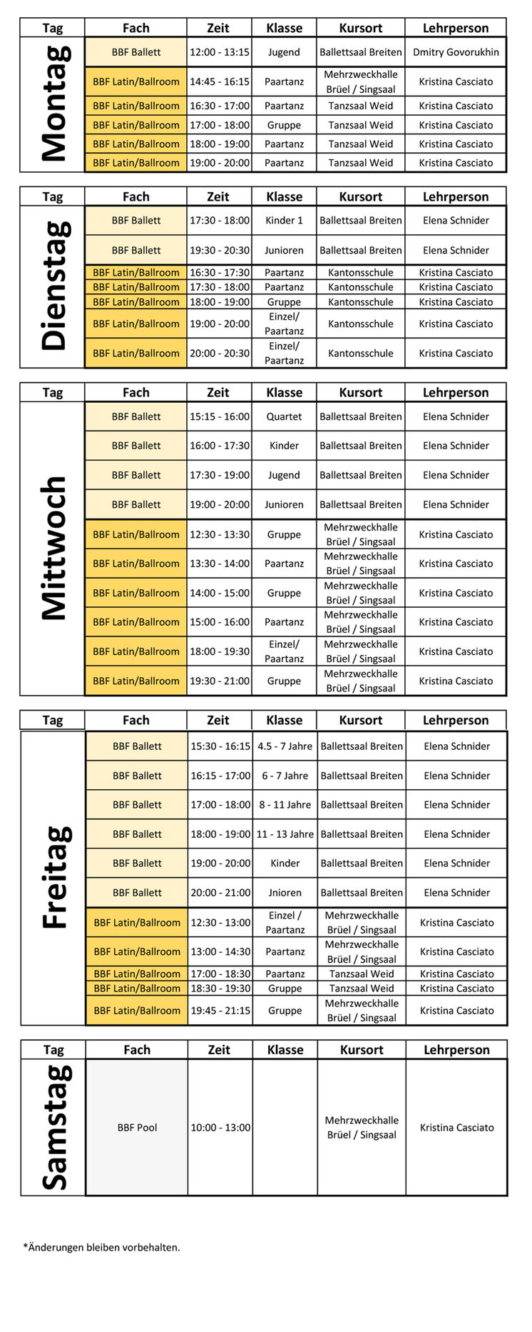 - Februar - März: Talentabklärungen bei Danse Suisse / Talentscouting Days Prüfung, mindestens Note B