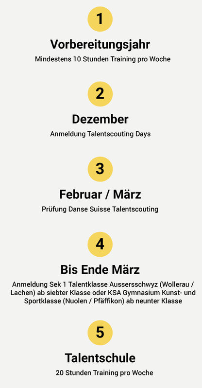 - Ein Jahr vor dem Eintritt in die Talentklasse Ausserschwyz oder ins KSA Gymnasium Kunst- und Sportklasse wird ein Pensum von mindestens 10 Stunden intensives Tanztraining pro Woche empfohlen